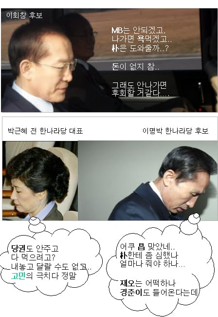 이회창 후보는 고민을 일단 끝냈다 치고, 이명박·박근혜 두 사람은 대체 무슨 생각들을 하고 있는 건지….