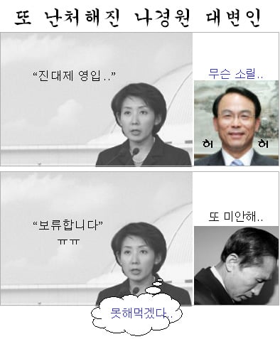 그나저나 이 후보보다 나경원 한나라당 대변인이 더 곤란해졌다. 위장 취업 의혹에 반박하다 결국 인정하고, 진대제 영입을 발표했다 이를 뒤집은 게 하필 두 번 모두 나 대변인이다.