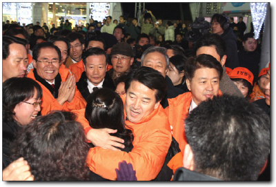 공식 선거전이 시작된 후 수도권을 집중 공략한지 3일째. 정 후보 표정은 불과 일주일 전 지지율 정체에 후보단일화마저 실패했던 때와는 사뭇 달랐다. 초조해하던 기색은 사라졌다.