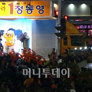 3일 오후 부산 최대 번화가 서면에 어둠이 깔렸다. 4.5톤 트럭을 개조한 유세차가 왕복 2차선 이면도로를 막아섰다. 좁은 길에 꽉 들어찬 인파를 헤치고 정동영 대통합민주신당 후보가 겨우 연단에 올랐다.