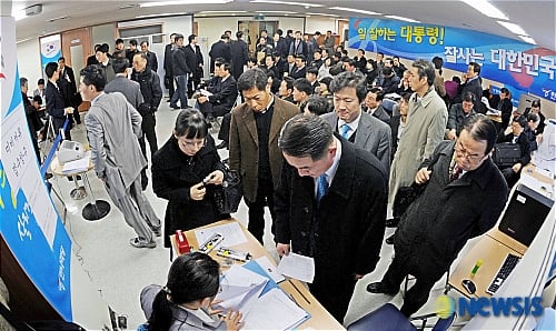 3일까지는 드문드문했던 신청 접수는 마감일이 다가오면서 폭주하고 있다. 때문에 한나라당 당사에 마련된 접수 창구는 북새통을 이루는 모습이다.