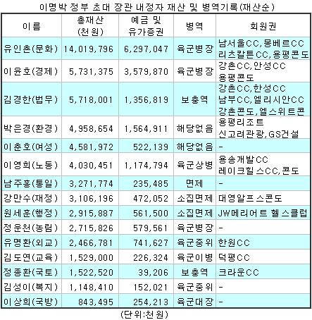 이명박 정부의 초대 장관 내정자 대부분이 상당한 재산가인 걸로 나타났다. 대부분 10억원 이상을 신고했으며 40억원대 3명, 50억원대 2명에 100억원 이상을 신고한 사람도 1명 있었다.