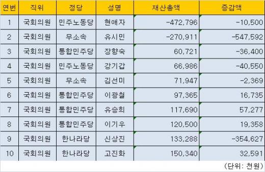 국회 공직자윤리위원회가 28일 공개한 2008년 국회의원 재산변동 사항에 따르면 정몽준 한나라당 최고위원을 포함한 7명의 한나라당 의원들이 상위 10위에 포함됐다.