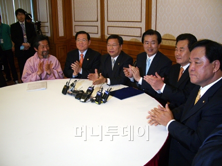 통합민주당, 자유선진당, 민주노동당 등 야 3당은 14일 연석회의를 열고 쇠고기 재협상 촉구 결의안에 서명했다. 이날 연석회의에는 김효석 민주당 원내대표, 권선택 선진당 원내대표, 천영세 민노당 대표를 비롯해 최인기 민주당 정책위의장, 류근찬 선진당 정책위의장, 강기갑 민노당 의원이 참석했다. 독자들의 PICK! "몇 명이랑 잤나 세어 보자" 장항준 19금 발언 파묘 "자궁에 젓가락 꽂히는 느낌" 김지민, 시험관 시술 이유 밝혔다 "시선 강탈 미모" WBC 한일전 카메라에 4번 잡힌 여성, 누구? "사랑해, 뽀뽀 쪽" 은퇴한 남편 녹음파일, 딸 결혼 앞두고
