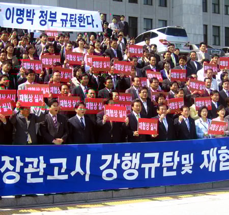 이들은 '재협상 실시', '고시강행 규탄'이라고 적힌 손 팻말을 들고 정부의 미국산 쇠고기 수입위생조건에 관한 농림식품부 장관 고시를 규탄했다.