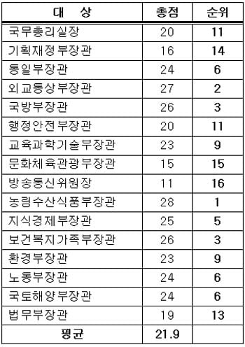 장 농식품부 장관은 28점으로 1위를 기록했고, 유명환 외교통상부 장관은 27점을 얻어 2위에 올랐다.
