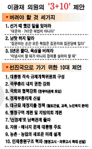 이명박 정부가 성공하려면 무엇을 해야 한다고 생각하는지 이 의원에게 물어봤다. 이 의원은 '경험'을 토대로 비판 대신 진심 어린 충고를 담은 기고문을 전해왔다. 이 기고문을 토대로 인터뷰를 가미해 '선진국을 향한 3+10' 제안을 재정리했다.