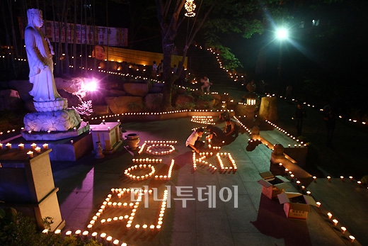 노사모 회원들은 수천개의 촛불을 준비해 절 입구에 자리한 관세음보살상 등이 놓인 마당에 촛불로 '편안히 잠드소서'라는 글자를 만들며 노 전 대통령을 추모했다. 절 안쪽으로 향하는 돌계단을 비롯 절 주변도 노란 빛을 비추는 촛불로 장식했다.