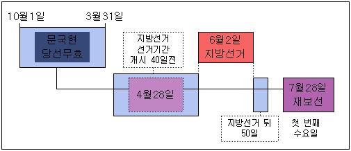 선거법 203조는 '재·보선 선거일이 국회의원 총선이나 지방선거의 선거기간 개시일 40일 전부터 선거일 뒤 50일 사이일 경우엔 총선·지방선거 선거일부터 50일 뒤 첫번째 수요일에 실시한다'고 별도 규정하고 있다.
