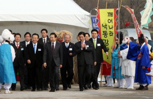 이 대통령은 오후에는 경북 달성군 달성보 건설현장에서 열린 '낙동강 살리기 희망 선포식'에 참석했다. 지난달 22일 영산강 기공식에 이어 4대강 중 영남과 호남의 젖줄인 낙동강과 영산강 기공식에 참석한 것이다.