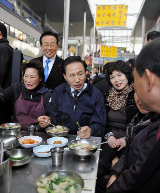 이 대통령은 수제비 가게를 찾아 시장 상인들과 수제비를 먹으며 "대선 때 약속을 지키려 왔다"고 밝혔다. 당뇨로 입원중인 김 할머니와 휴대폰으로 통화한 이 대통령은 "할머니. 나 대통령이에요. 편찮으시다면서요. 내가 그때 국수 한 그릇 먹고 당선됐잖아요. 빨리 쾌유하세요. 이다음에 오면 꼭 뵐게요"라고 말했다.