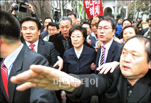 총리 재직 시절 인사 청탁과 함께 5만 달러를 받은 혐의로 기소된 한명숙 전 총리가 8일 오후 서울 서초 서울중앙지방법원에서 첫 공판을 마친 뒤 지지자들에게 둘러싸인 채 법정을 나서고 있다.
