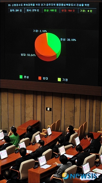 국회는 이날 본회의에 상정된 '신행정수도 후속대책을 위한 연기·공주지역 행정중심복합도시건설특별법 개정안'에 대해 찬반토론 뒤 표결을 실시해 출석의원 275명 가운데 찬성 105명, 반대 164명, 기권 6명으로 부결시켰다.