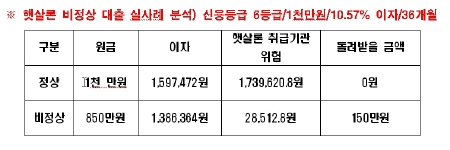 이범래 의원 측이 밝힌 햇살론 취급 금융회사들의 계산법은 철저히 금융회사 이익 중심으로 이뤄져 있다. 신용등급 6등급인 사람이 햇살론 1000만원을 10.57%(10월 7일 현재 이자율)로 36개월 대출 받을 시 정상적이라면 금융회사가 상환받아야 할 원금은 1000만원, 이자는 159만7472원이다.
