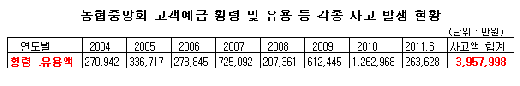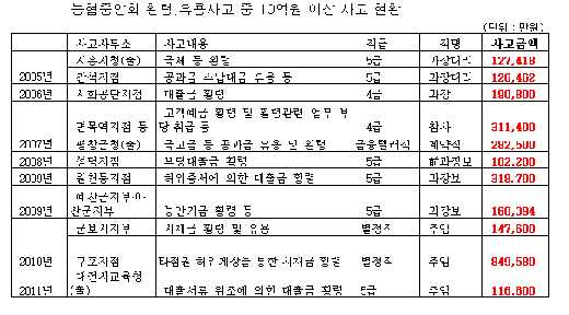 특히 올 3월 대전시교육청 농협중앙회 출장소의 5급 과장대리 직원이 대출서류 위조를 통해 11억6000만원에 달하는 거액 대출금 횡령사고를 일으켰다. 지난해 11월 에는 구포지점에서 별정직 주임직원이 타점권 허위 계상을 통해 시재금 84억9580만 원을 횡령했다. 농협중앙회 단일 횡령 사고액으로 가장 큰 규모다. 2009년에 예산군지부에서는 16억8000만원에 달하는 농안기금 횡령사고도 발생했다.