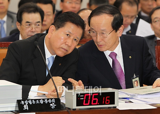 최원병 농협중앙회장(왼쪽)이 이덕수 농업경제대표이사가 22일 오전 서울 여의도 국회에서 열린 국회 농수산위원회의 농협 국정감사에서 이야기를 나누고 있다. 지난 19일 열린 국회 농수산식품위원회의 농림수산식품부 국정감사에서 강봉균 민주당 의원이 "제보에 따르면 1년 동안 실제로 받는 봉급이 12억6000만원이나 된다."고 주장한 바 있다. 농협중앙회는 묵묵부답이다가 논란이 일자 "7억 원 정도밖에 받지 않는다."며 진화에 나선 것으로 알려졌다. 독자들의 PICK! '왼쪽 발목 부상' BTS RM, 깁스 사진 올리며 "ㅠㅠ" 장혁 논현동 빌딩 '286억'…75억 대출받아 11년 만에 130억↑ '외도' 아내, 25층 매달려 협박…남편, 결국 상간남 만남 허락 "확 달라진 얼굴"...김지민 퉁퉁 붓고 멍 잔뜩 '깜짝', 무슨일?