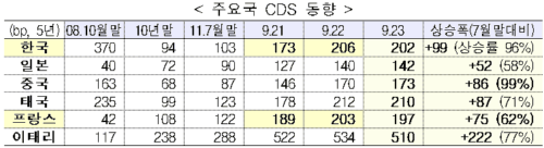 실제로 부도가 날 수 없는 나라 일본의 경우 142bp로 52bp(58%) 상승했고 세계 최대의 외환보유고를 자랑하는 중국도 173bp로 86bp(99%) 올랐다고 강조했다.