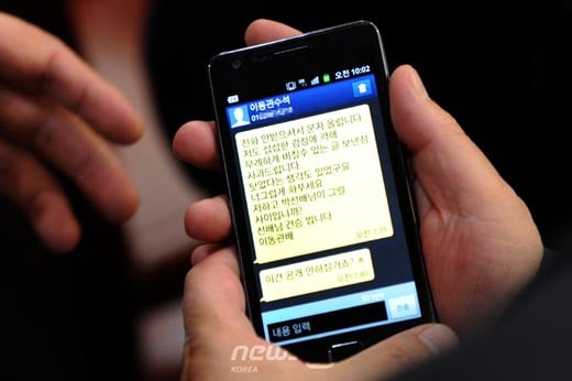 (서울=뉴스1) 한재호 기자= 민주당 박지원 의원이 5일 오전 서울 서초동 대법원에서 벌어진 국정감사장에 들어서며 동료 의원에게 이동관 청와대 언론특보에게서 재차 온 문자메시지를 보여주고 있다. 이 특보는 4일 "그정도 밖에 안되는 인간인지 몰랐다"는 문자 메시지를 박 의원에게 보내 논란이 불거지자 '주어'가 빠진 실수라고 해명했다. 독자들의 PICK! "한국 맞아?"...남편 전처들과 한집살이 "너무 친해" 이혼 포기 '동서와 내연관계' 남편 의심한 아내, 결국 '친자확인' 검사…결과는? 은행 취업 실패→유튜버로 대박...'77억 전셋집' 공개 "돈 안 줘서, 복수한다 생각"...정선희, 故안재환 실종 신고 안 한 이유
