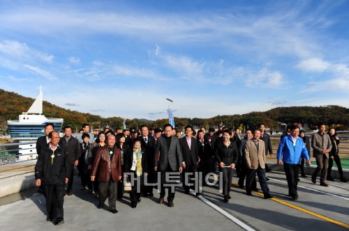 한편 이 대통령은 이날 기념식과 리셉션에 앞서 이포보 공도교에서 미리 준비된 시루떡을 커팅한 뒤 30분간 다리를 부인 김윤옥 여사와 함께 도보로 건넜다.