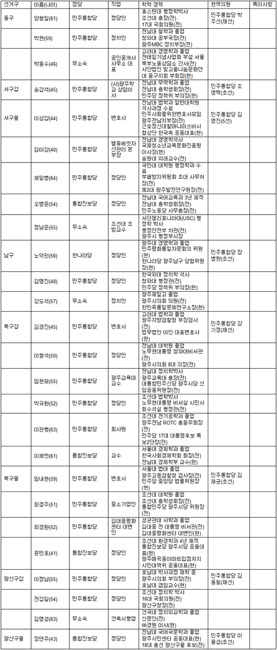 16~18대 총선에서 광주의 현역 의원 물갈이 비율은 평균 68%에 이르러 전북과 전남에 비해서도 그 비율이 매우 높다.