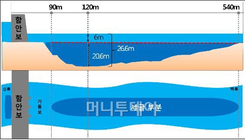김 의원은 13일 국회에서 가진 기자회견에서 "지난 12일 4대강 사업 낙동강 18공구 창녕 함안보 현장을 방문해 조사한 결과, 계획보다 수심이 깊어져 최고 26.6m 하천 지반이 내려앉는 세굴 현상이 발생한 것을 확인했다"고 밝혔다.