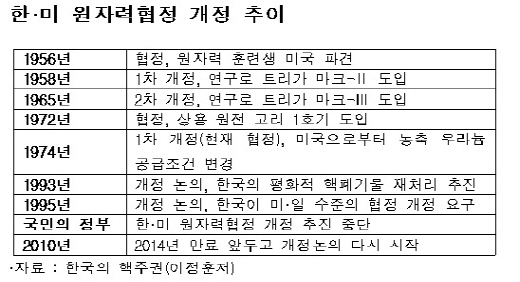 지난 1974년 체결된 한·미 원자력협정은 오는 2014년 만료되기 때문에 이전에 연장 또는 개정을 해야 하는 상황이다. 정부는 협정 만료 이전인 올해 말까지 개정을 완료한다는 목표를 세우고, 사용후 핵연료 재처리 권한 등 평화적 핵주권을 확보하기 위해 미국 측과 지난 2010년부터 협상을 이어오고 있다.