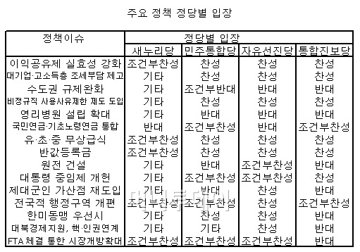 중앙선거관리위원회가 19대 총선을 앞두고 각 정당이 제출한 공약을 바탕으로 작성해 25일 발표한 '정책의제에 대한 정당별 기본입장'이라는 자료를 분석한 결과다.
