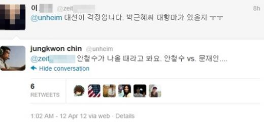 진 교수는 "대선이 걱정이다. 박근혜씨 대항마가 있을지 모르겠다"는 한 트위터리안(@zeit***)의 한숨에 "안철수가 나올 때라고 본다. 안철수 VS 문재인"이라고 답하며 안철수 서울대 융합과학기술대학원장의 등판을 기대했다.