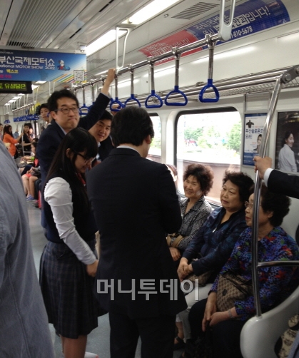 한 시민은 "부산 사람들이 요즘 안철수 원장에게 관심이 많다"며 "이렇게 전철을 타는 모습이 보기 좋다"고 말했다.