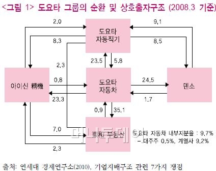 실제로 일본 토요타자동차의 경우 토요타 가문의 지분율은 10%에도 못 미치지만 계열사 사이에 순환출자를 통해 경영권을 유지하고 있고, 직접 상호출자한 경우도 상당수다. 토요타는 먼저 ‘자동직기→토요타차→덴소→자동직기’로 이어지는 순환출자 고리를 갖고 있다. 여기에 토요타차는 자동직기 지분은 23.5% 보유하고 있고 자동직기 역시 덴소 지분을 8.5% 갖고 있어 상호출자 관계도 형성된다.