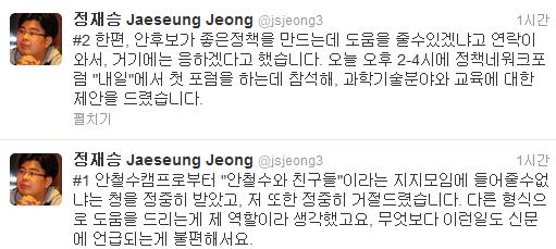 정 교수는 이날 토론 후 자신의 트위터(@jsjeong3)에 "간혹 정부 위원회에 참석해 회의를 해봤는데, 간만에 즐거운 회의였다"며 "생산적인 대화"였다고 소감을 밝혔다.