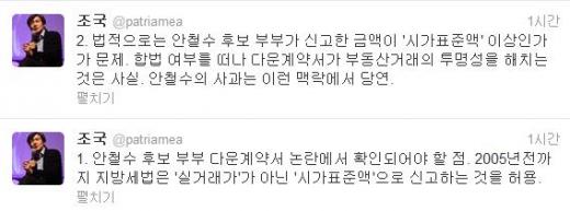조 교수는 28일 자신의 트위터(@patriamea)를 통해 "안철수 후보 부부 다운계약서 논란에서 확인되어야 할 점. 2005년 전까지 지방세법은 '실거래가'가 아닌 '시가 표준액'으로 신고하는 것을 허용"이라며 "법적으로는 안철수 후보 부부가 신고한 금액이 '시가표준액' 이상인가가 문제"라고 지적했다.