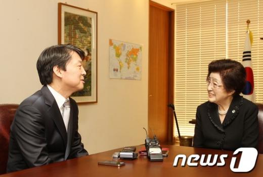 안 후보는 이날 오전 11시30분 서울 마포구 김대중도서관 내 김 전 대통령의 집무실에서 이 여사를 만나 30여분 간 환담을 나눴다.