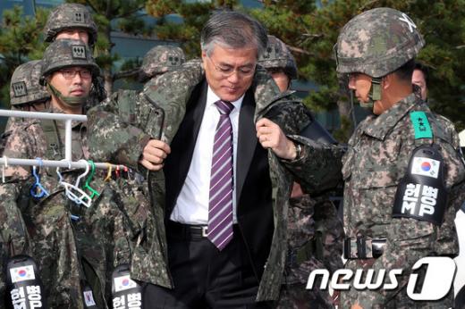= 문재인 민주통합당 대선후보가 1일 오전 22사단 소속 GOP부대를 방문하기 위해 강원도 고성군 동해선도로남북출입사무소 앞에서 군복을 입고 있다.2012.11.1/뉴스1 <저작권자 뉴스1 코리아, 무단전재 및 재배포 금지> ☞ 뉴스1 바로가기 독자들의 PICK! 윤미래, 뒤늦게 알려진 사망 소식..."긴 여행 떠나" 동서와 갈등→파혼 2번 아내..."조카는 남편 아이" 의심 충격 추성훈, '파격' 누드 화보 공개…"돈 안 받아, ♥야노 시호도 촬영" "남성 의사가 은밀한 곳 봤잖아" 이혼 선언…산부인과서 난동