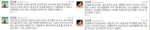 심 후보는 2일 자신의 트위터(@sangjungsim)에 "새누리당 남성 의원들이 갑자기 여성의 시대가 열린 것 같이 ‘여성대통령론’ 띄우기에 올인 하는 것도 씁쓸하다. 여성을 비하하고, 여성을 성추행하고, 여성을 억압해 온 당사자들이 과거는 싹 잊어버린 것 같다"고 평가했다.