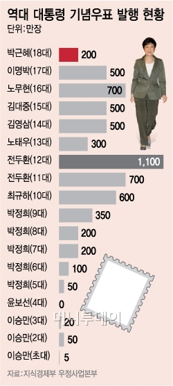 단일 횟수로 가장 많이 발행된 대통령 기념우표는 1981년 12대 전두환 전 대통령 기념우표로 1100만장이나 나왔다. 박 당선인 기념우표 발행량이 역대 대통령 우표보다 적은 것은 우표를 사용하지 않는 시대적 분위기 탓이란 분석이다.