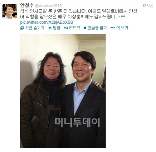 안 후보는 트윗과 함께 이씨와 함께 올린 사진을 올렸다. 해당 트윗은 500여건이 리트윗(재전송)되는 등 누리꾼들의 큰 호응을 끌고 있다.