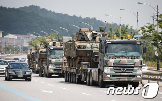 오는 10월1일 개최되는 건군 제65주년 국군의 날 행사에 참가하는 장갑차 등 군장비가 19일 오후 경기 성남 서울공항으로 이동하고 있다. 군장비와 병력은 이달 30일까지 날짜별로 분산 이동하며 장비가 이동하는 도로에는 부분 교통통제가 이루어질 예정이다. 2013.8.19/뉴스1
