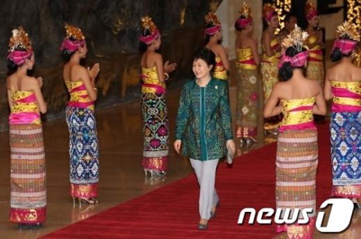 (서울=뉴스1) 박철중 기자 = (서울=뉴스1) 박철중 기자 박근혜 대통령이 7일(현지시간) 인도네시아 발리 누사두아 컨벤션센터에서 열린 APEC 정상회의 전통의상 기념촬영에서 인도네시아 전통의상을 입고 입장하고 있다.(청와대 블로그) 2013.10.9/뉴스1 <저작권자 뉴스1 코리아, 무단전재 및 재배포 금지> ☞ 뉴스1 바로가기 독자들의 PICK! 윤미래, 뒤늦게 알려진 사망 소식..."긴 여행 떠나" "군살 하나 없네"...산다라박, 과감한 비키니 '깜짝 뒤태' 눈길 신수지, 또 무슨 일?…"억울하고 황당한 일 당해" 의미심장 글 동서와 갈등→파혼 2번 아내..."조카는 남편 아이" 의심 충격
