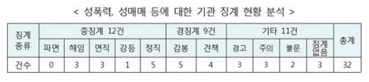 이 의원이 공개한 '산업통상자원부 및 산하 공공기관 성범죄 현황' 자료에 따르면 2008년부터 현재까지 발생한 직원 성범죄 및 성매매 건수는 산업부 6건, 한국전력 7건 등 총 32건이다. 이중 63%(20건)은 경징계에 해당하는 '감봉' 이하의 처벌을 받았다.