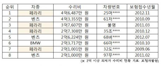 13일 새누리당 이노근 의원이 보험개발원에서 제출받은 자료에 따르면 교통사고 사망자 평균 보상금 1억300만원(2011년 기준, 위자료 및 일실 수익 포함)보다 더 높게 보험금이 청구된 외제차 수리비가 2010~2012년 동안 43건에 달하는 것으로 나타났다. 총 금액으로는 69억1000만원, 대당 보험료 평균은 1억6000만원에 달했다.