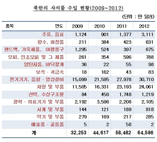 국회 외교통일위원회 소속 윤상현 새누리당 의원이 14일 대북(對北) 반출제한 사치품 목록을 기준으로 북한의 사치품 수입현황을 분석한 결과, 김정일 체제에서 연간 3억 달러 내외(2008년 2억7214만 달러, 2009년 3억2253만 달러) 규모였던 사치품 수입액이 김정은이 후계자로 공식 등극한 2010년 4억4617만 달러로 늘어난데 이어 2011년에는 5억8482만 달러로 전년도 대비 31%가 급증했다. 이어 2012년에는 6억4586만 달러로 또다시 전년도 대비 10.4% 증가하는 등 매년 신기록을 경신하고 있는 것으로 드러났다.