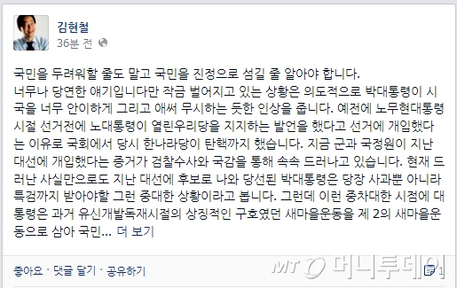 김 교수는 이날 자신의 페이스북에 이같이 언급하고 "노무현 대통령 시절, 선거 전에 노 대통령이 열린우리당을 지지하는 발언을 했고 선거 개입했단 이유로 당시 국회에서 한나라당이 탄핵까지 했다"며 "현재 드러난 사실만으로도 박 대통령은 당장 사과뿐 아니라 특검까지 받아야 할 중대한 상황이라고 본다"고 주장했다.