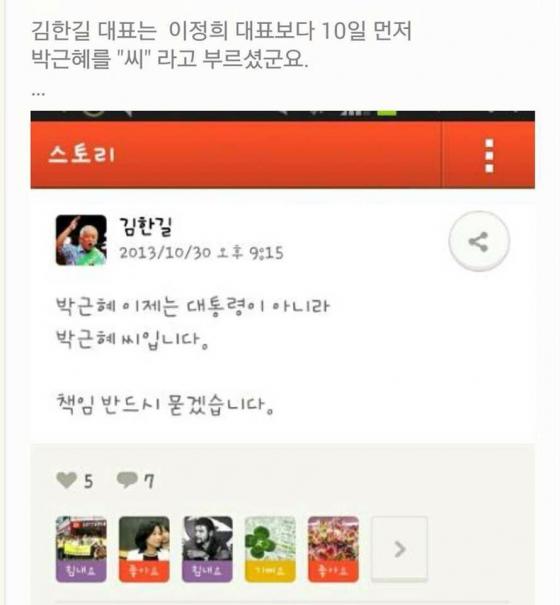이에 당시 민주당 관계자는 "김한길 대표는 카카오스토리에 그런 게시물을 올린 적이 없다"며 게시물이 합성됐다고 밝혔다.