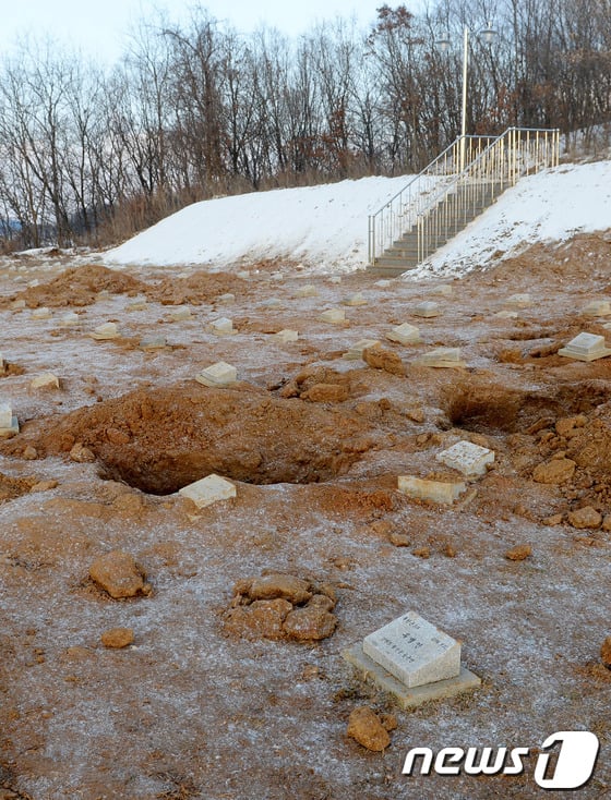 (파주=뉴스1) 손형주 기자 19일 중국군 유해가 묻힌 경기도 파주시 적성면 적군묘지가 유해송환 작업을 앞두고 개토되어 있다.