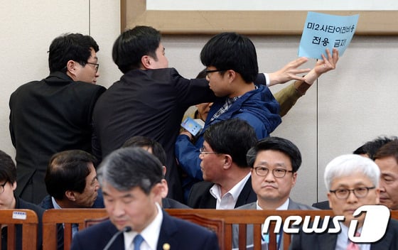 = (서울=뉴스1) 박세연 기자 15일 오후 여의도 국회에서 열린 국회 외교통일위원회 전체회의에서 한미방위비분담 특별협정 비준동의안이 의결되는 순간 한 시민단체 회원이 한미방위비분담 비준을 반대하며 피켓시위를 하다 직원에게 저지당하고 있다. 기습적인 피켓시위에는 평화와통일을여는사람들(평통사), 참여연대, 민변 등 시민단체 회원들이 참석했다. 2014.4.15/뉴스1 <저작권자 뉴스1 코리아, 무단전재 및 재배포 금지> 독자들의 PICK! 김신영, 8년 열애 끝 결별 고백…"전남친 어머니와는 계속 연락" 박지윤 루머 유포자=전남편 최동석?...누리꾼 고소했더니 "맨날 씨뿌리고 다녀" 박정수, 75세에 늦둥이 본 김용건 '일침' '병든 남편' 학대하는 아내..."엄마는 아빠 버려도 돼" 아들의 눈물