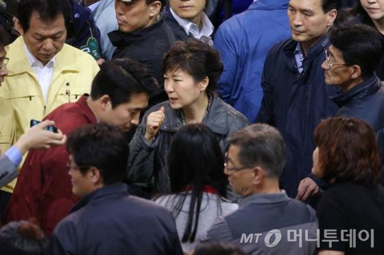 박 대통령이 이날 오후 4시20분쯤 모습을 드러내자 체육관 곳곳에서 실종자 가족들의 울분이 터져 나왔다. 가족들과 취재진이 뒤엉켜 체육관 단상 위에 오르기까지만 5분여가 소요됐다.