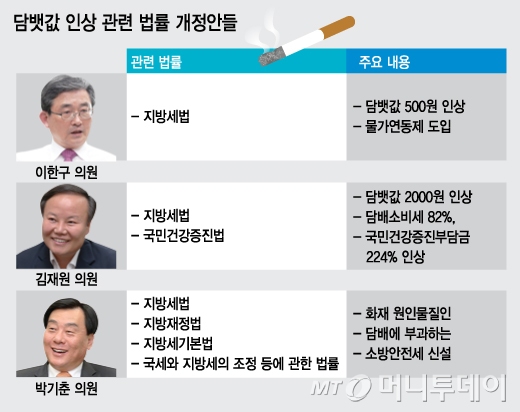 개정안에는 지방세법상 담배소비세를 인상해 담배 1갑(20개비) 가격을 500원 일시에 인상하는 한편 이후에도 물가연동제에 따라 담배 가격이 오르도록 담배소비세를 매년 자동 인상하는 내용이 담길 예정이다.