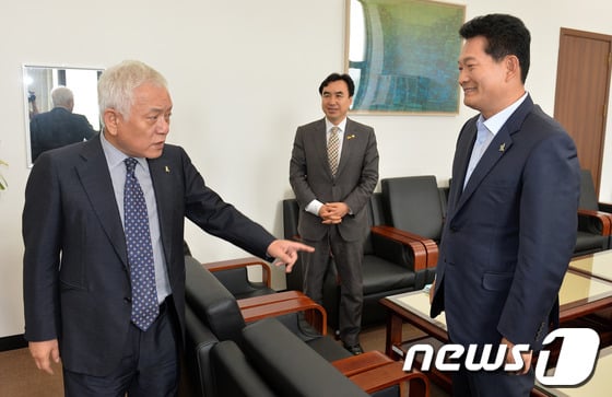 (서울=뉴스1) 박세연 기자 김한길 새정치민주연합 공동대표가 20일 오전 여의도 국회 당대표실을 방문한 송영길 인천시장과 대화하고 있다. 2014.6.20/뉴스1