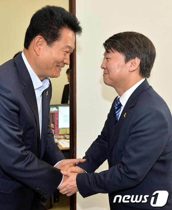 (서울=뉴스1) 박세연 기자 안철수 새정치민주연합 공동대표가 20일 오전 여의도 국회 당대표실을 찾은 송영길 인천시장과 인사하고 있다. 2014.6.20/뉴스1